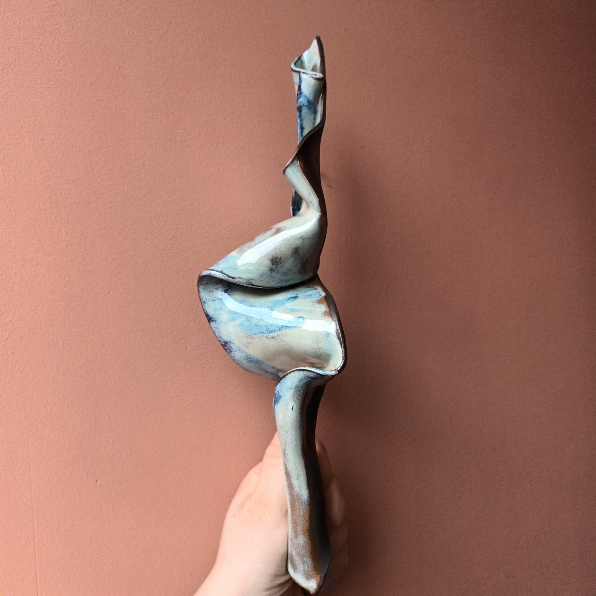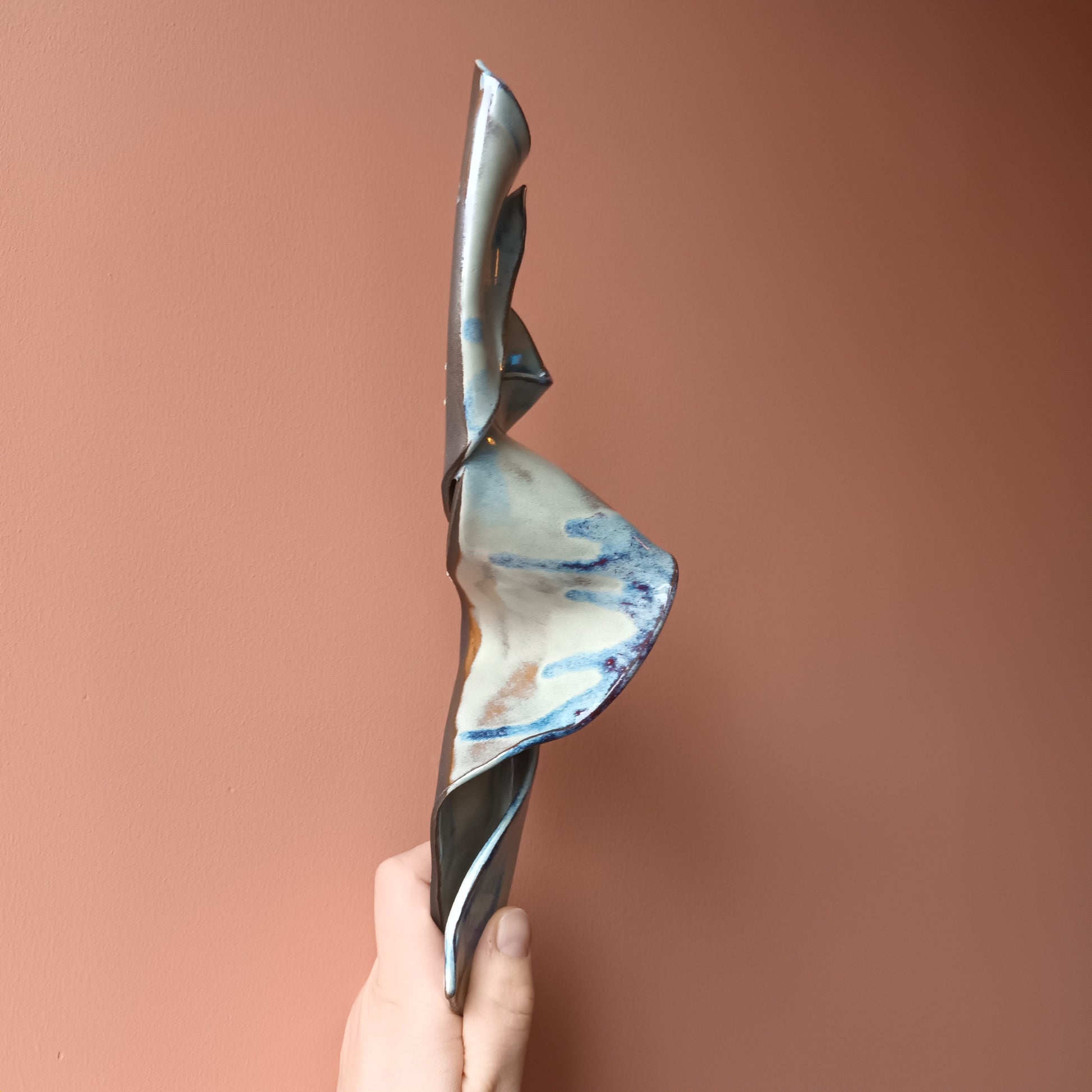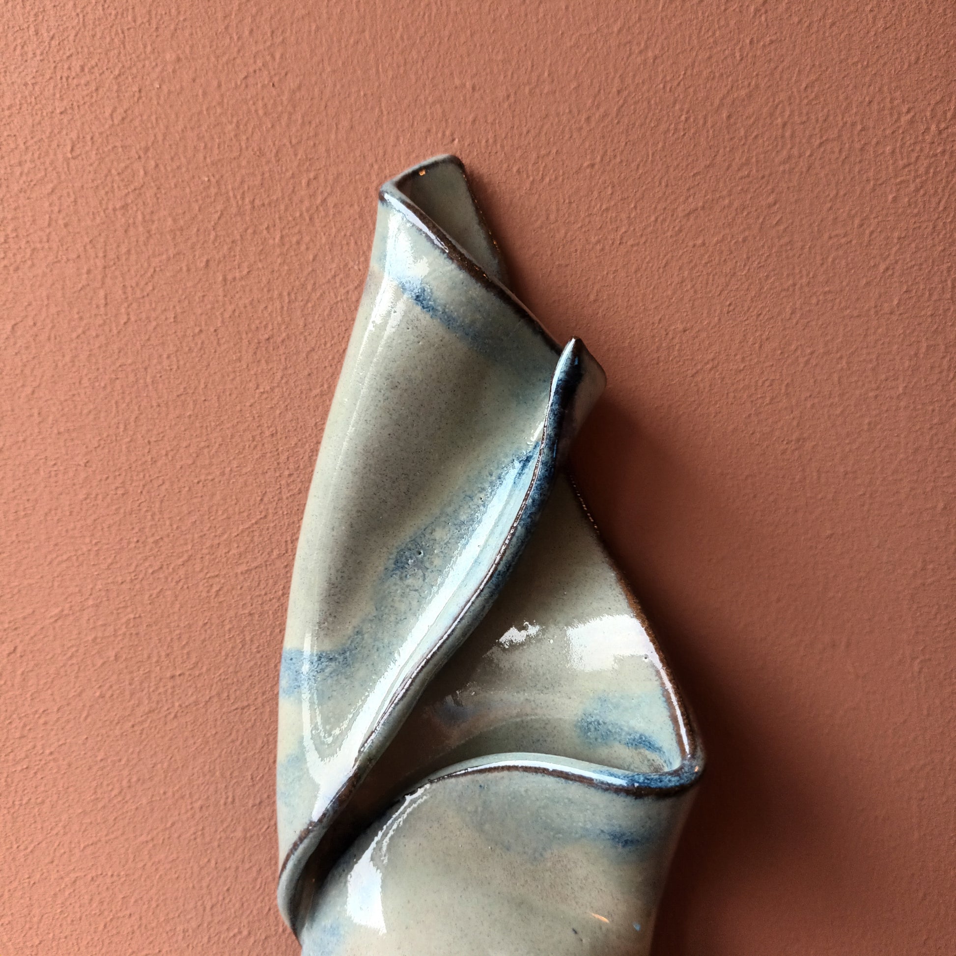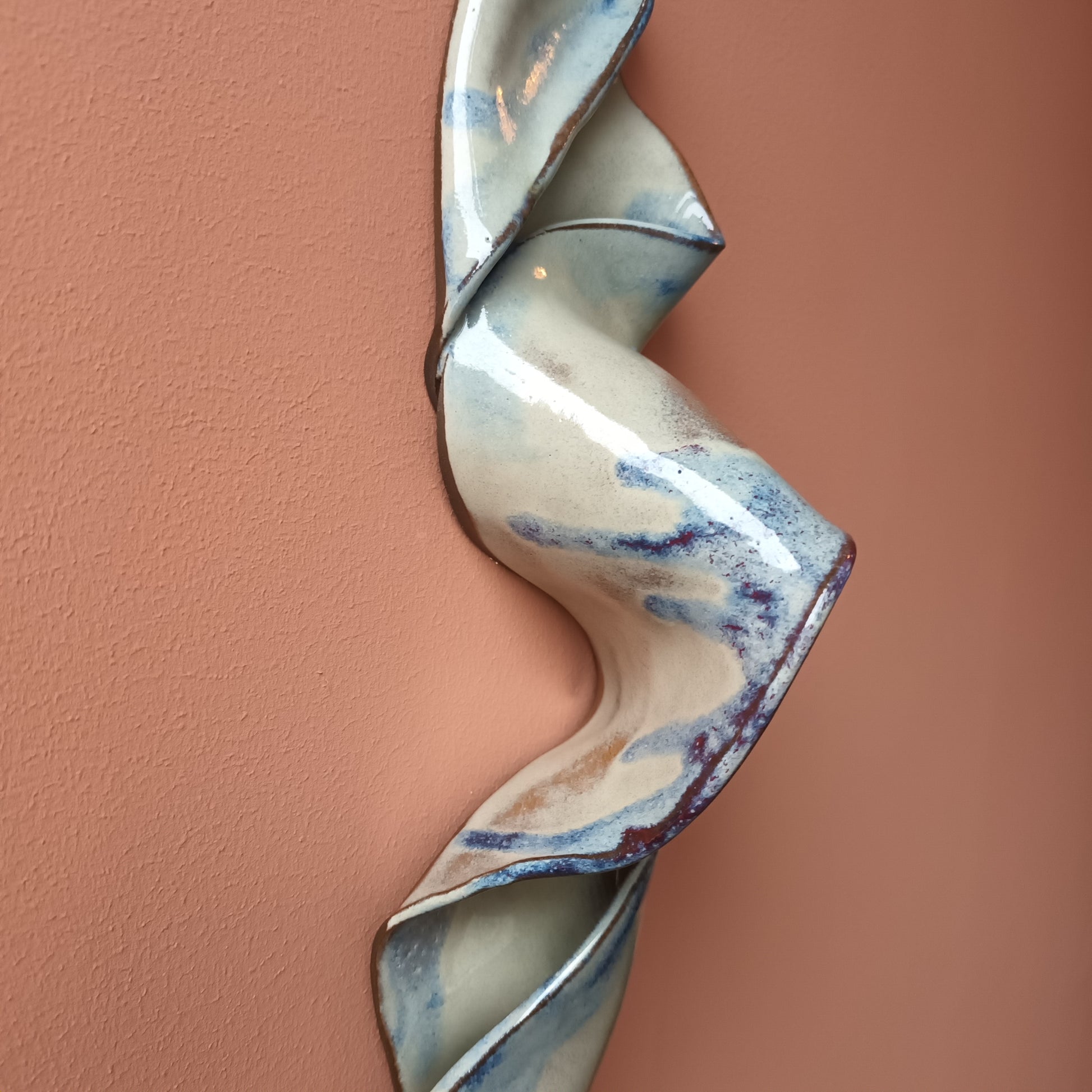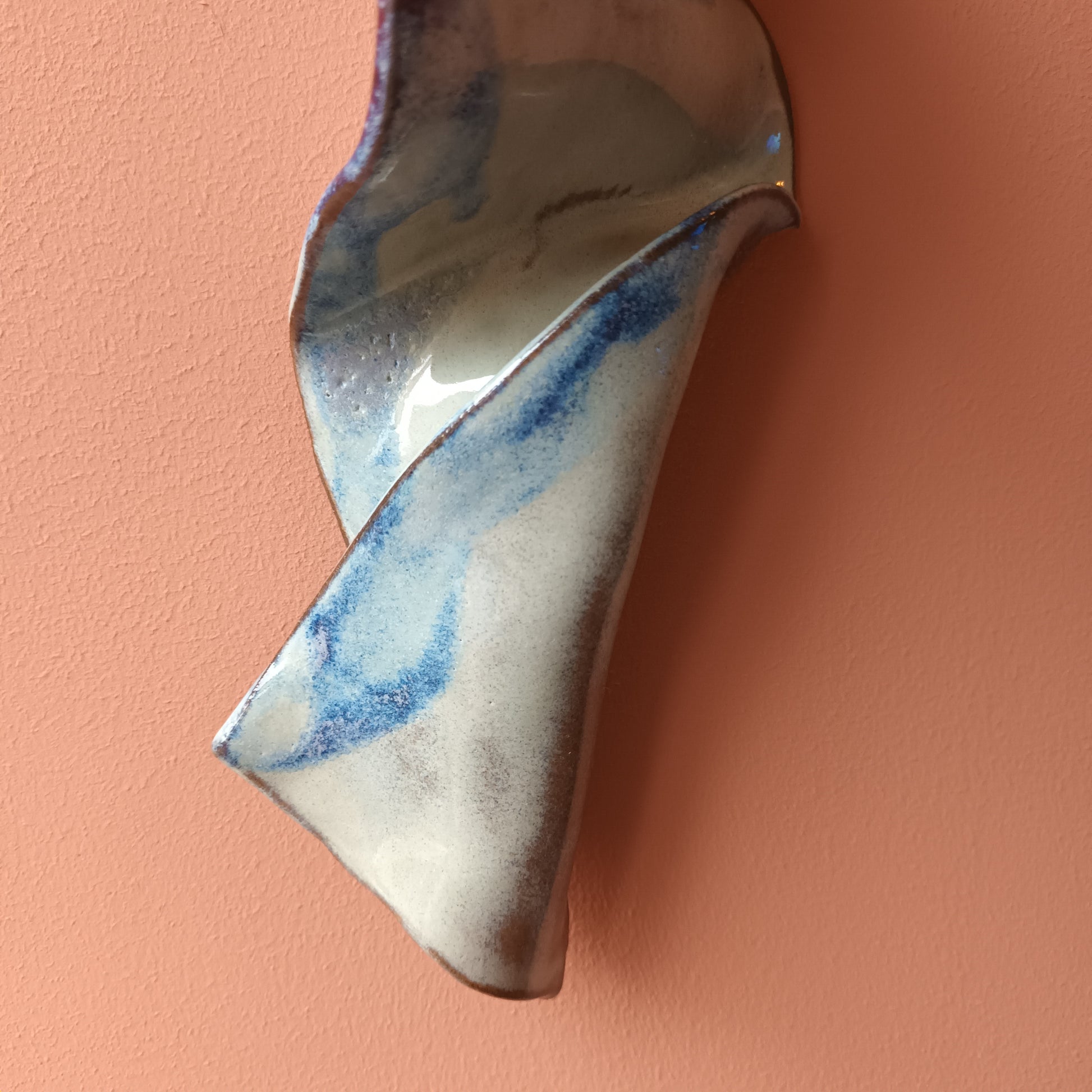 Blågrøn krummelure med røde nuancer. Unika keramikkunst modelleret og håndmalet af Martine Othilie. Hæng den på din væg og skab dybde og liv.