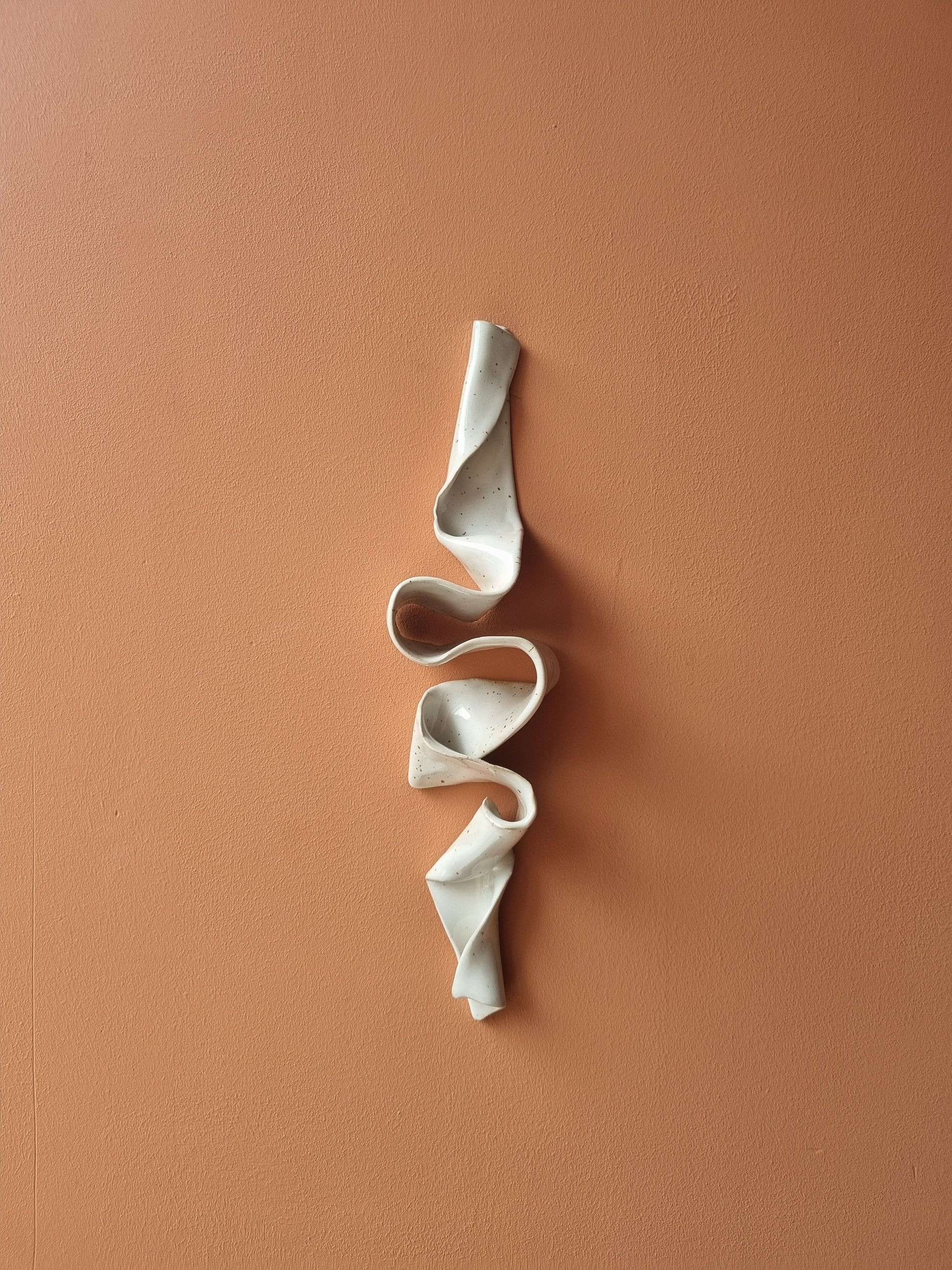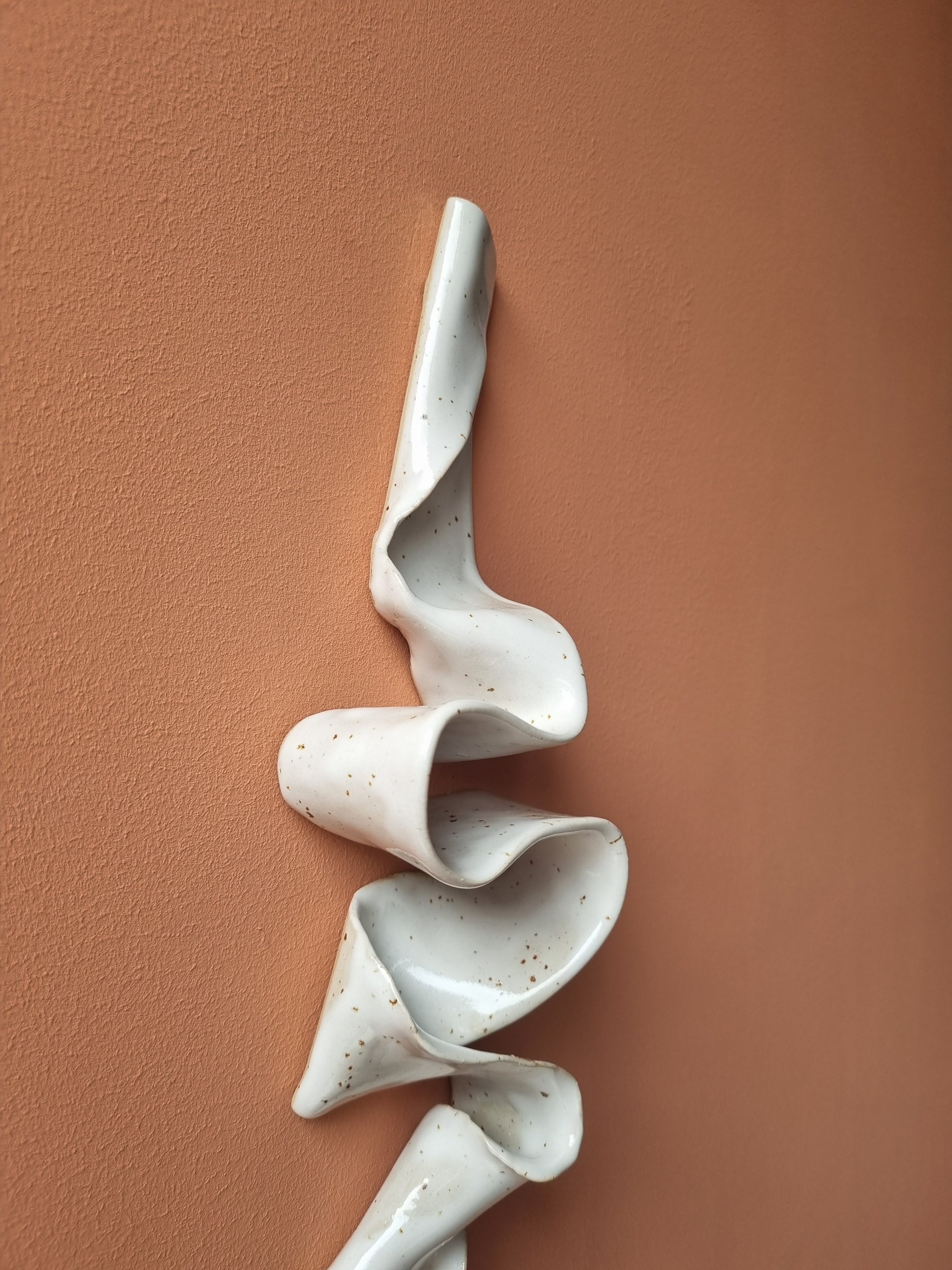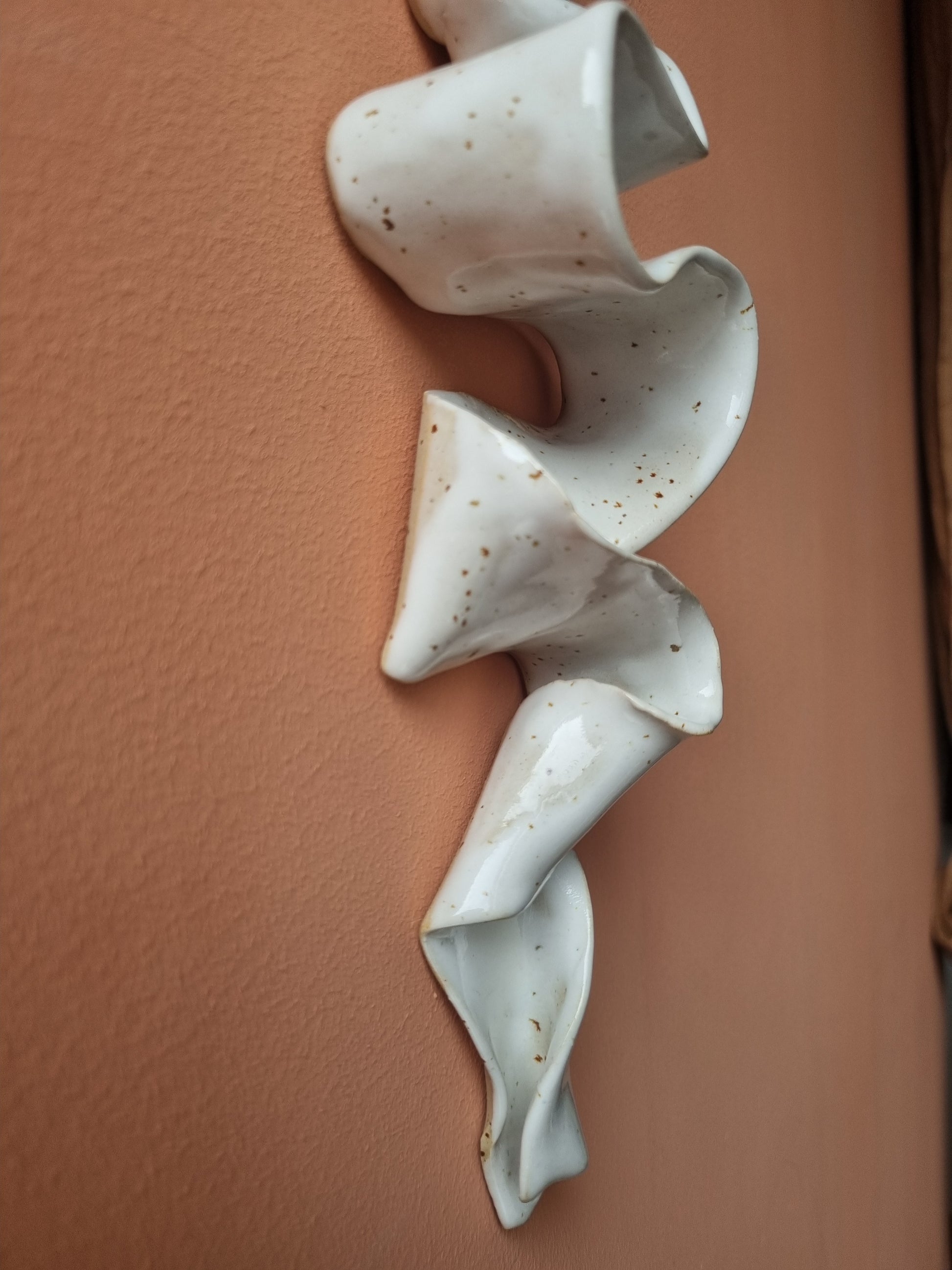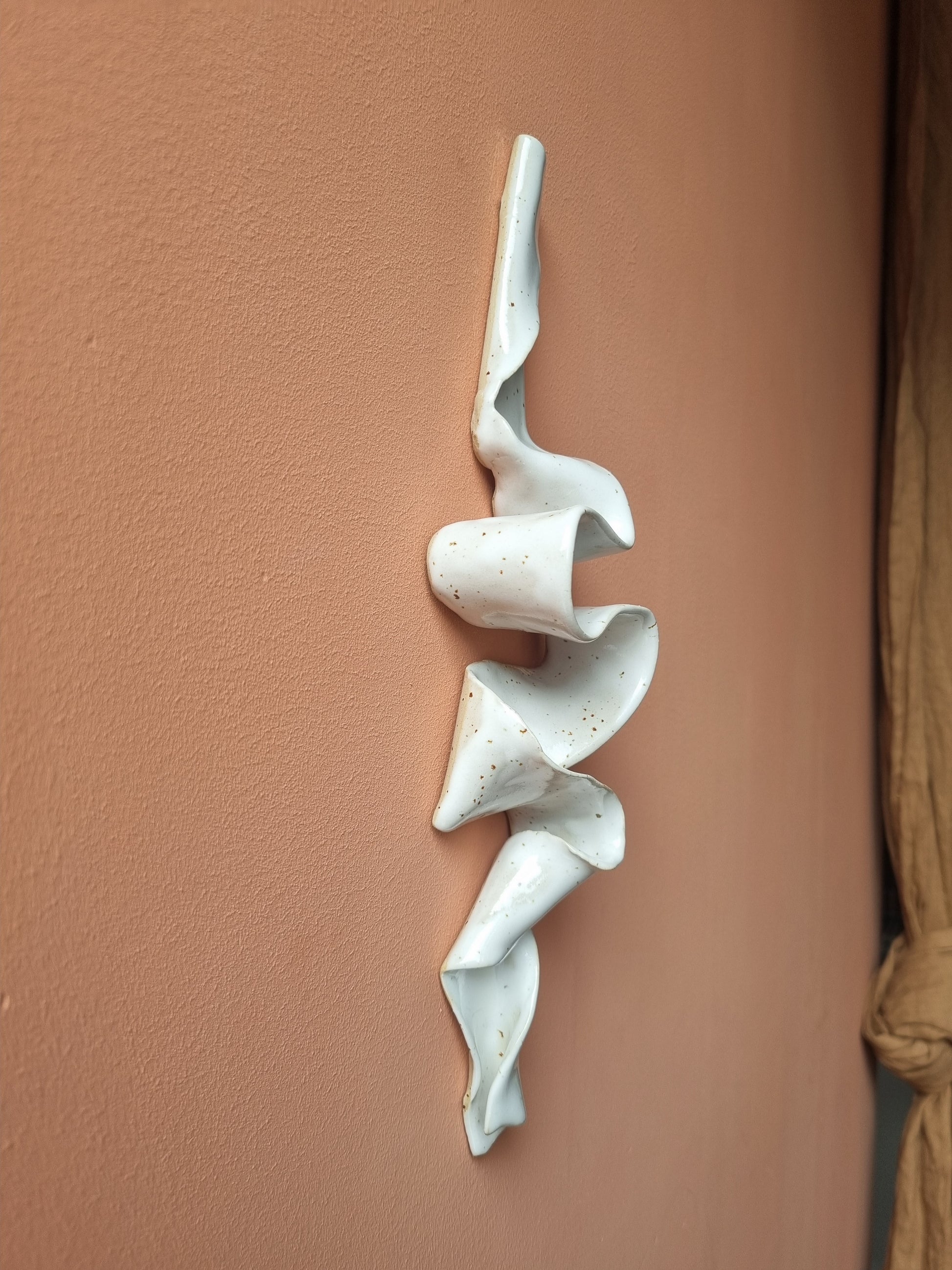 Lækker hvid krummelure med lavapletter, der vil skabe stemning og dybde på din væg. Håndlavet unika lavet af keramikkunstner Martine Othilie.