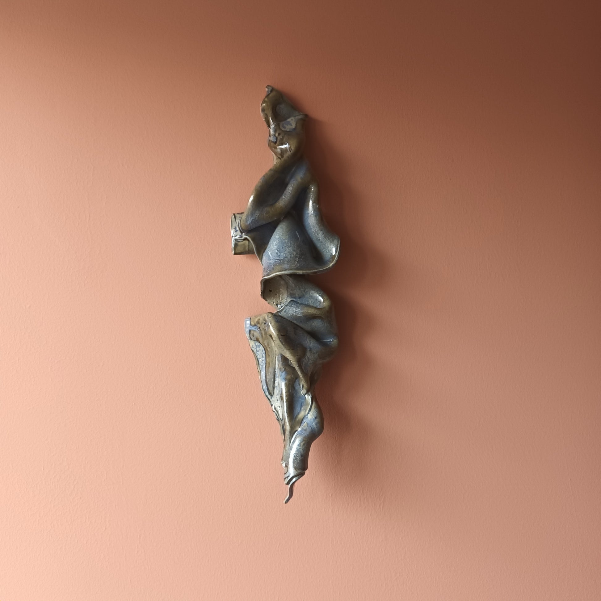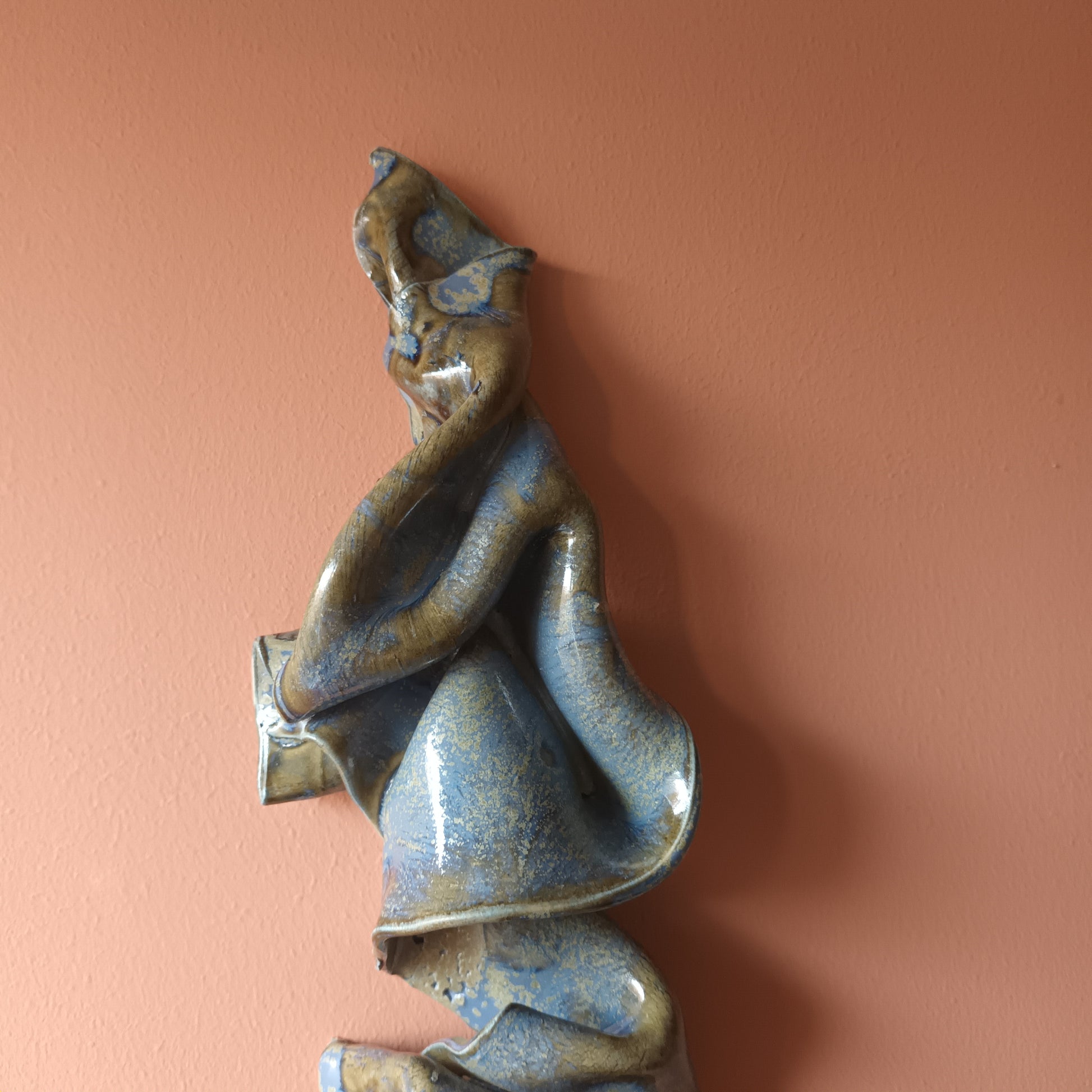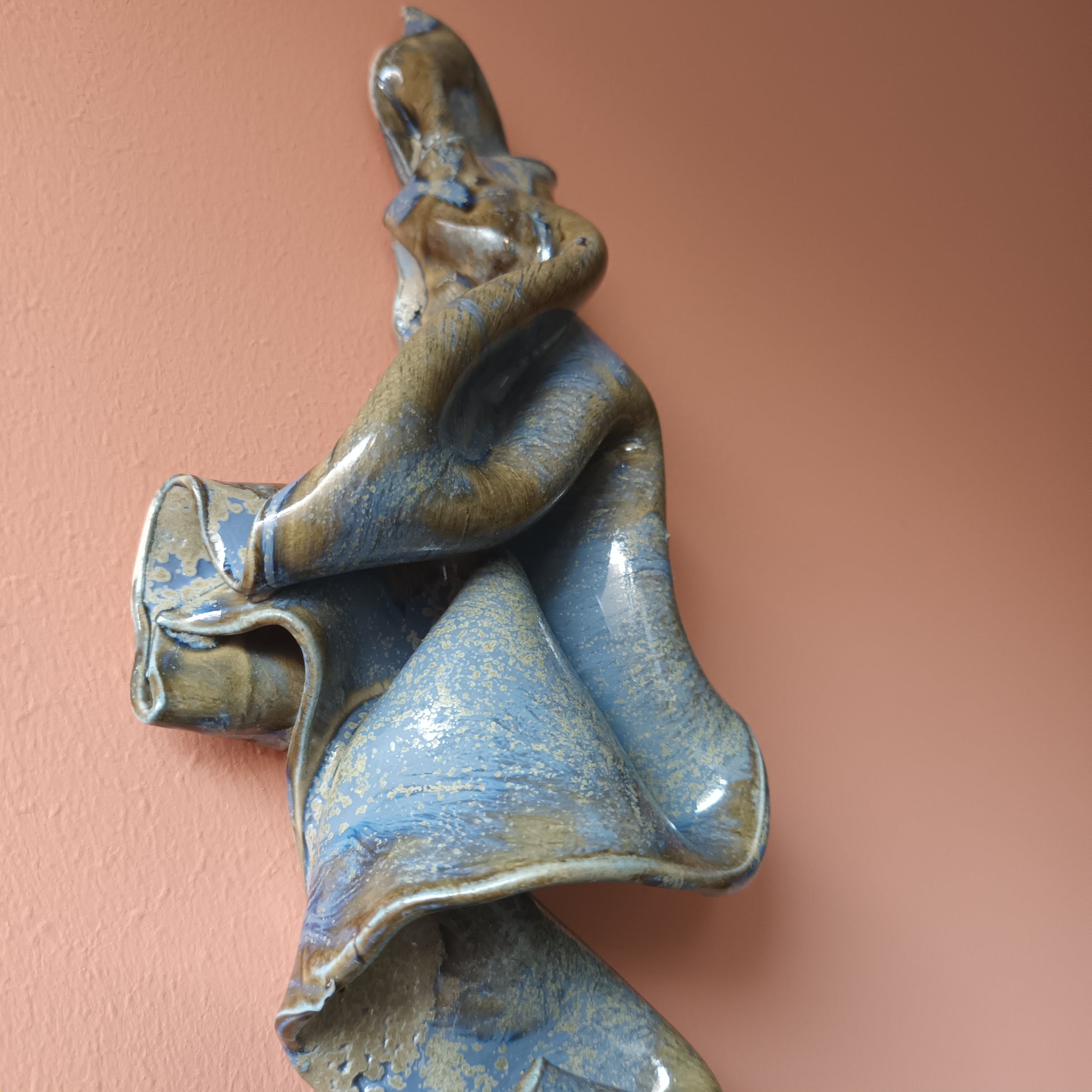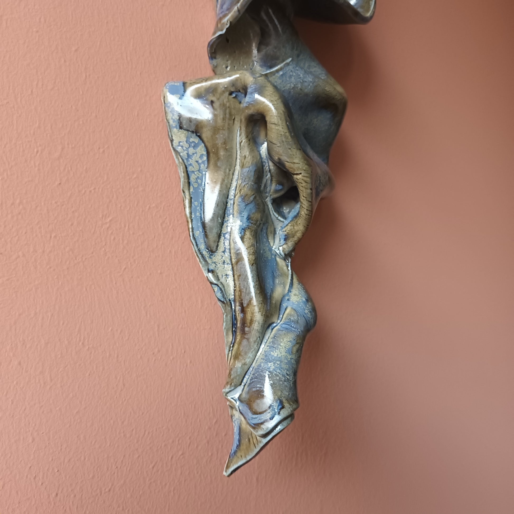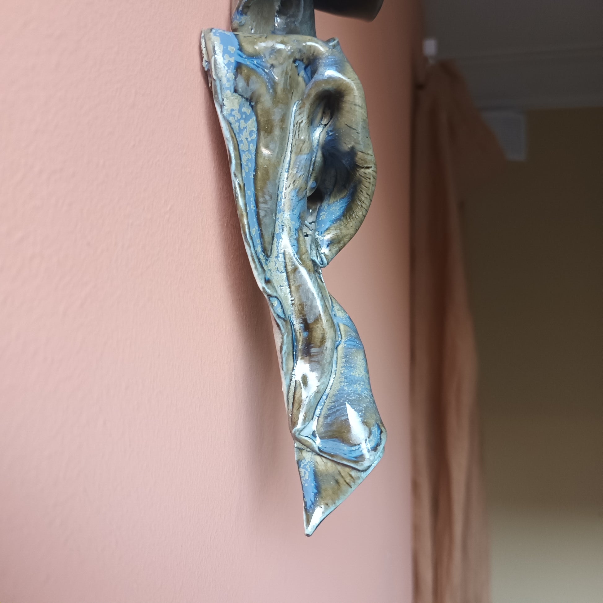 Blågrøn krummelure med masser af spil i glasuren og spræl i formen. Hæng den for sig selv eller som et indspark til din billedvæg :)