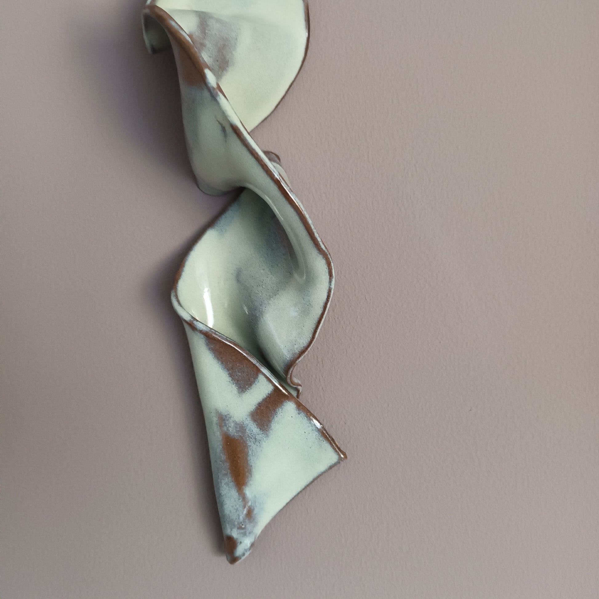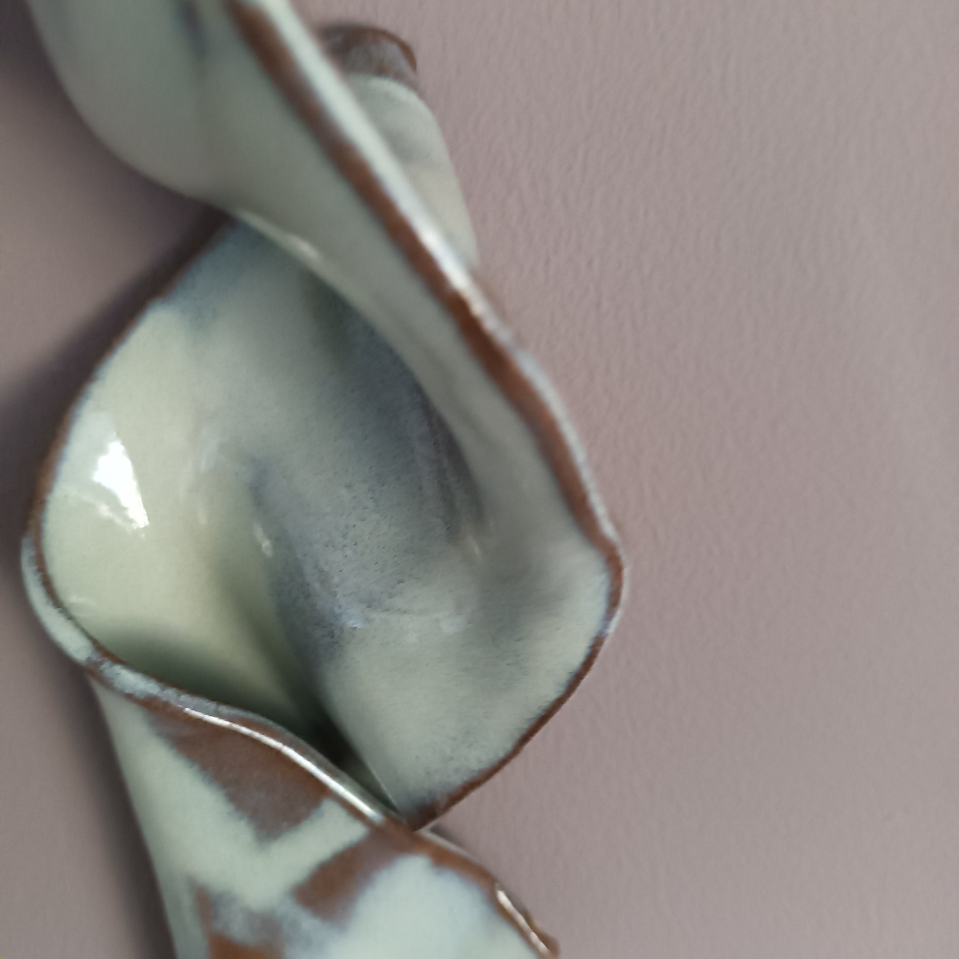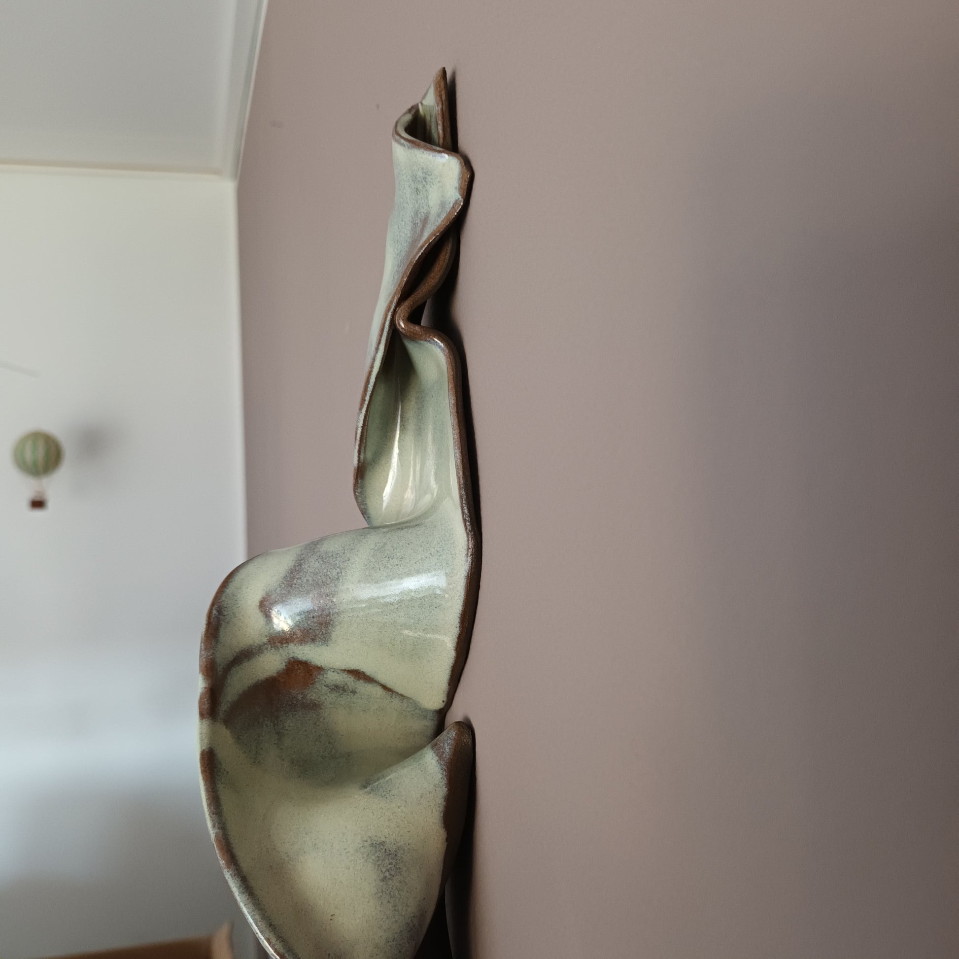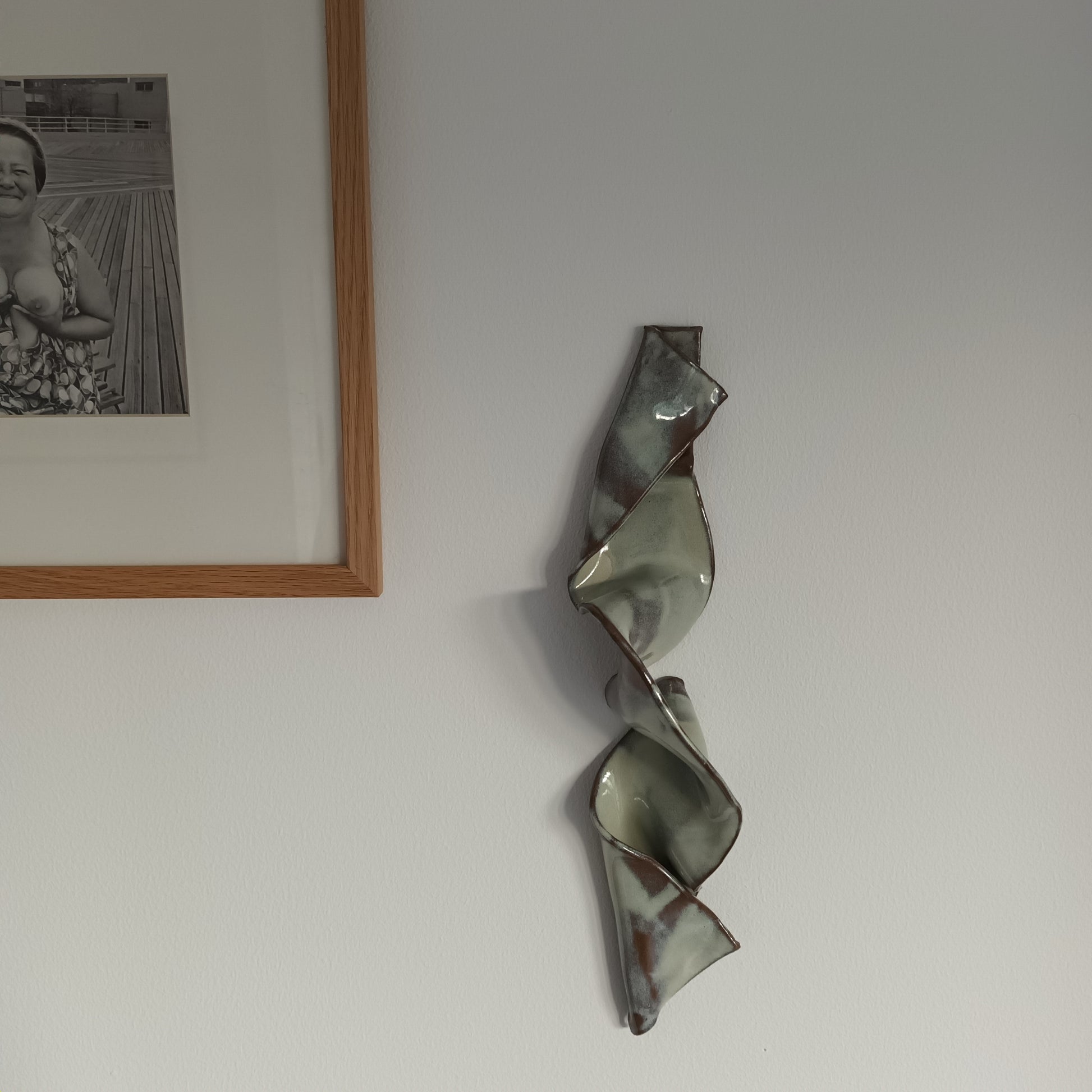 Lyseblågrøn keramikkrummelure i sort ler. Giver dybde og sjæl til væggen :)