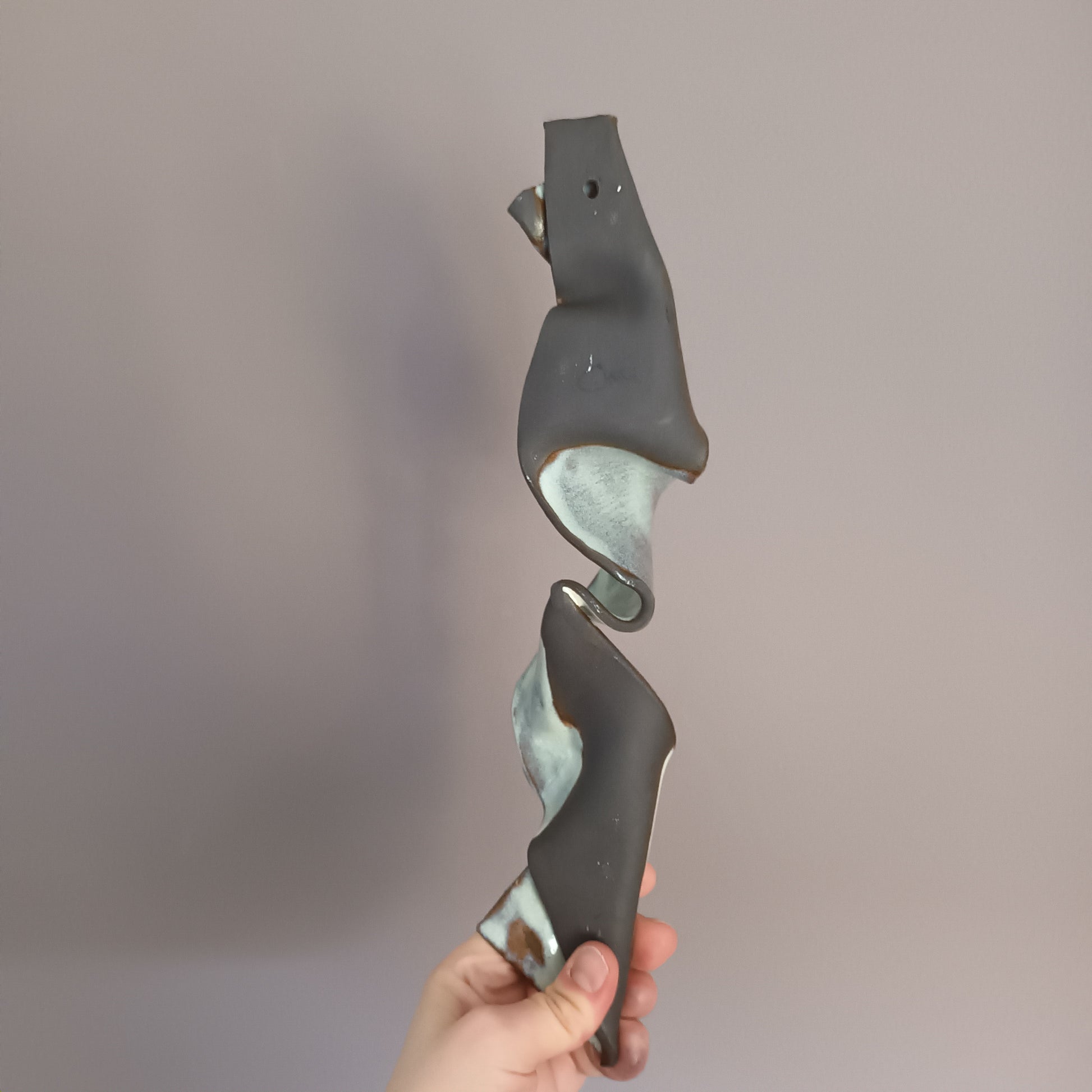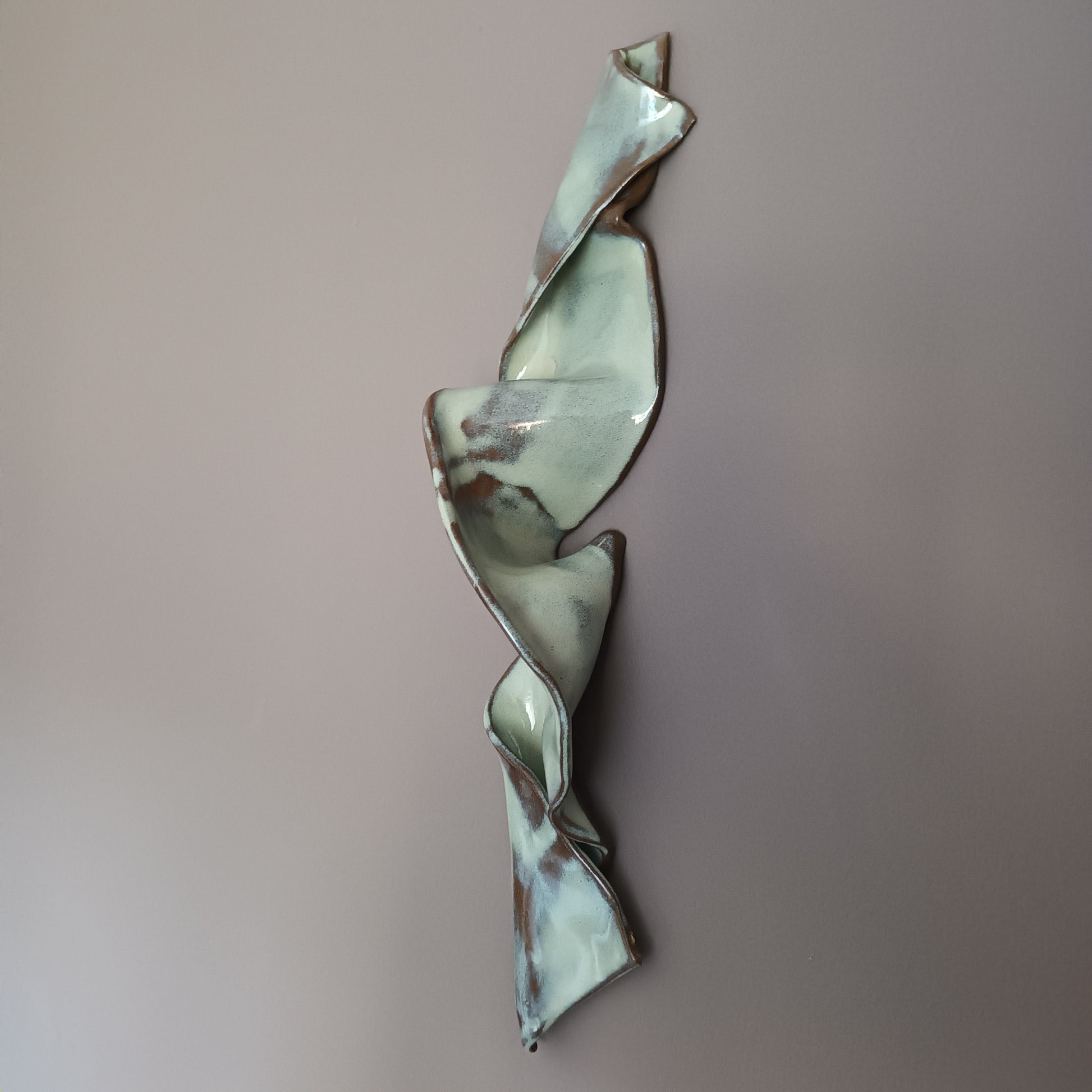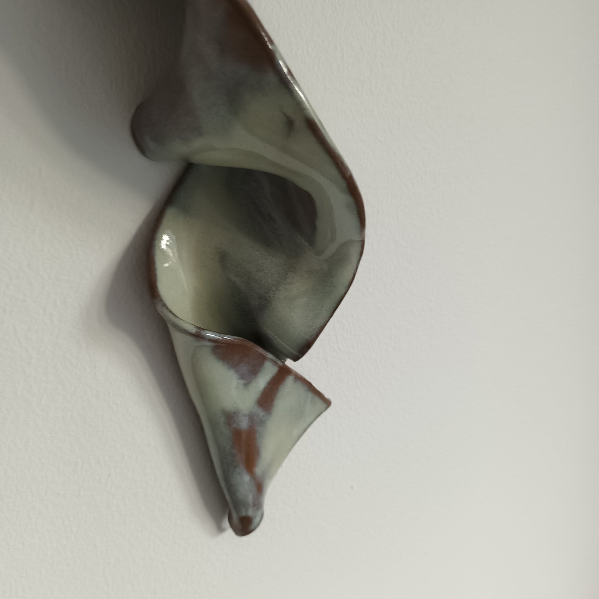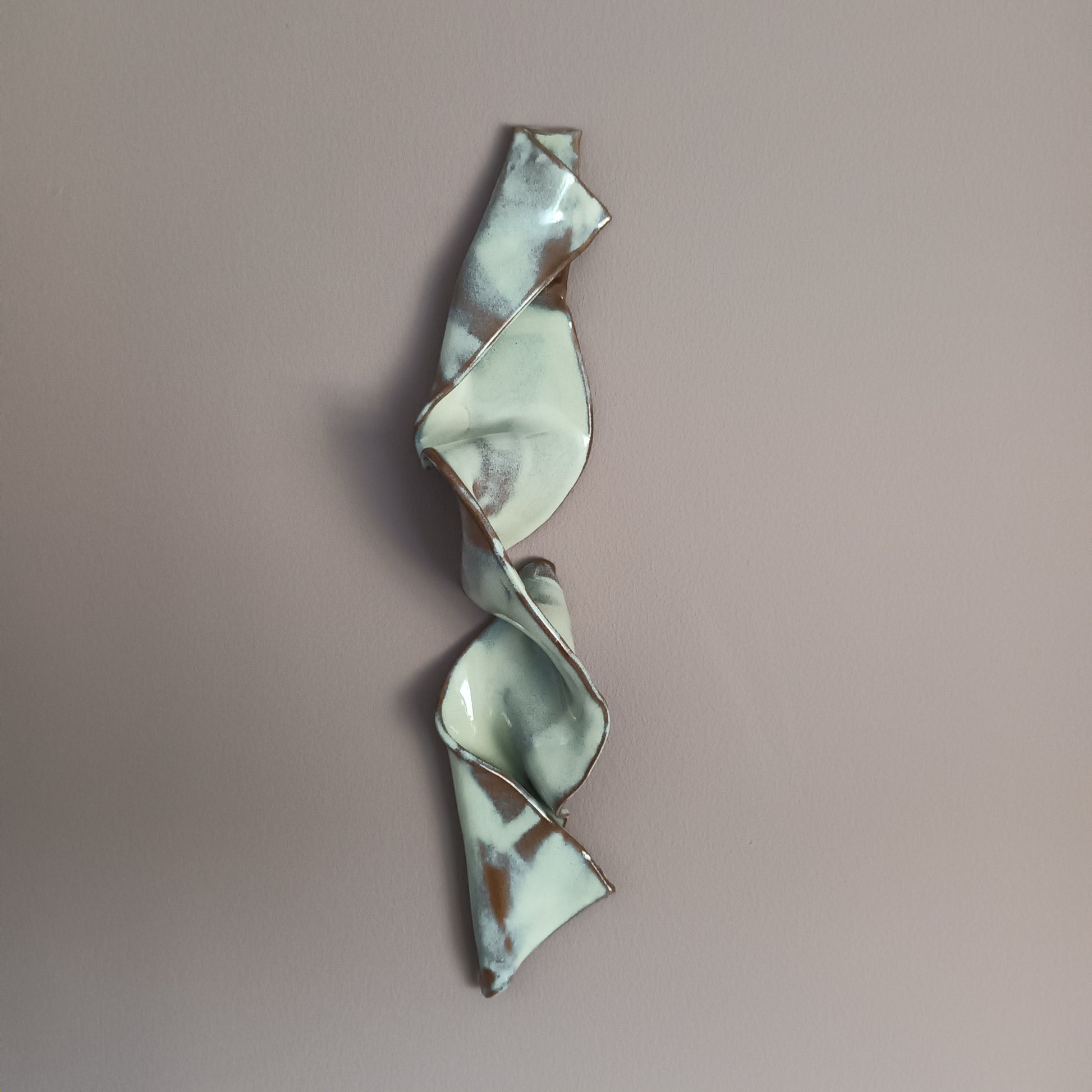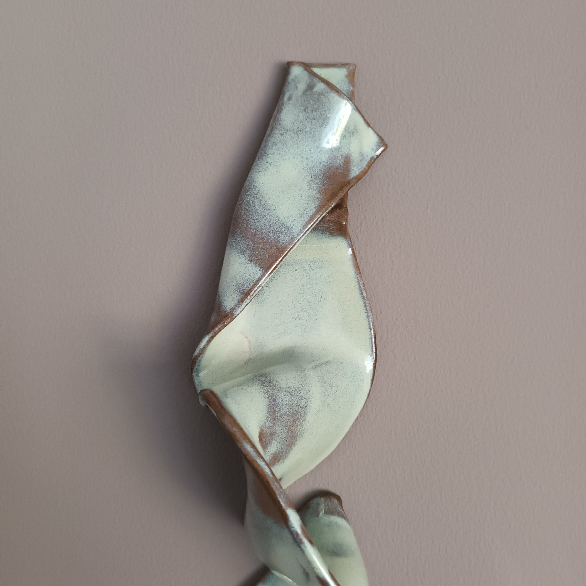 Lyseblågrøn keramikkrummelure i sort ler. Giver dybde og sjæl til væggen :)