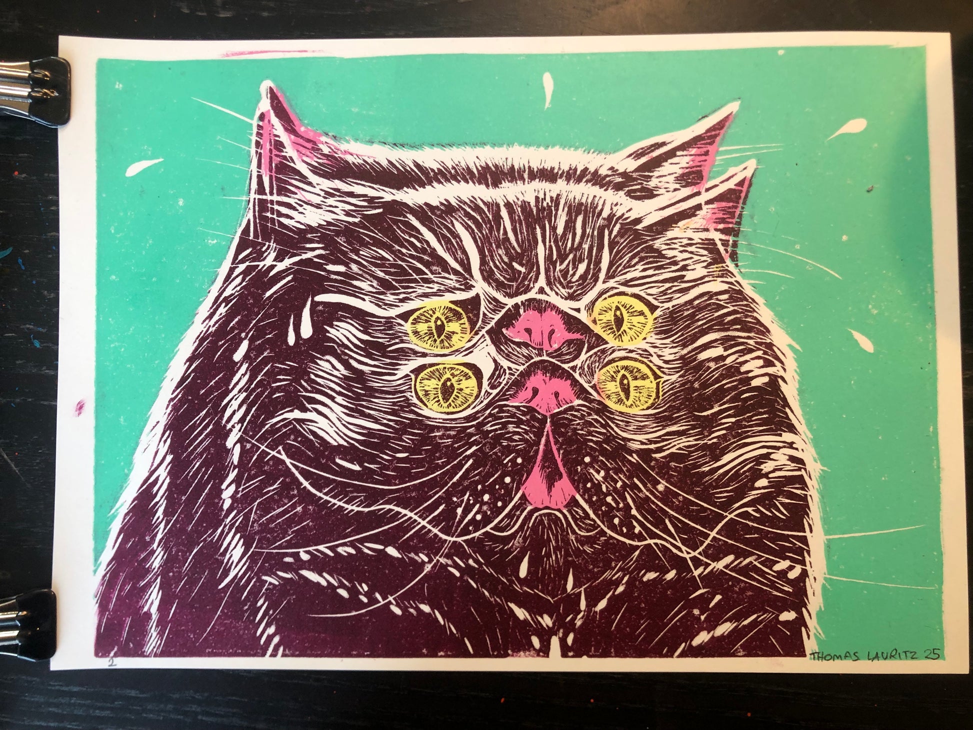 Linoleumstryk, trykt med oliesværte på 250g cremefarvet syrefrit papir.